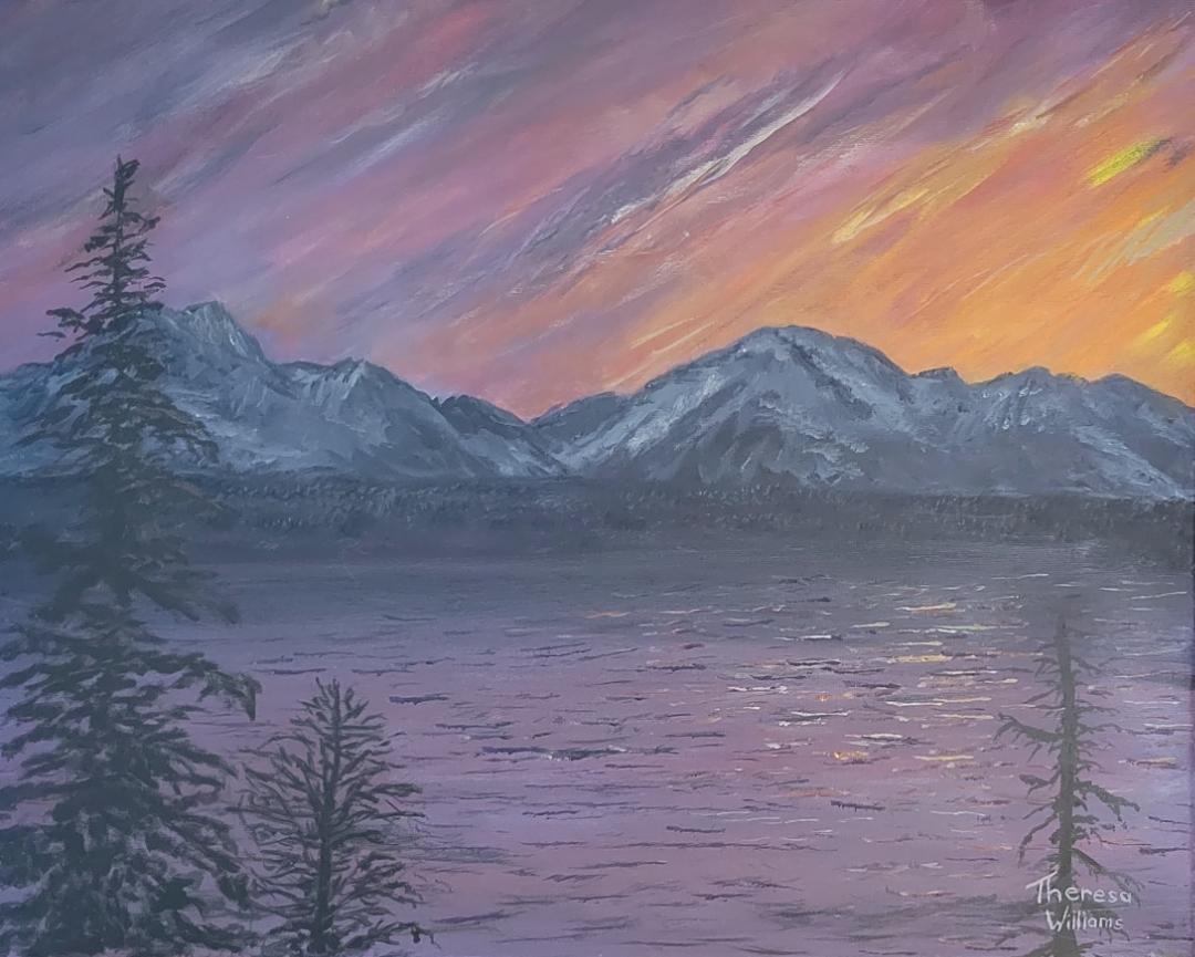Theresa Williams is a Pacific Northwest Native. Theresa began painting in her teens as a self-taught artist, and has tried different styles and techniques, such as charcoal and collage. She took a break from painting, but continued on her creative journey. Aside from painting, she is a quilter, gardener, card maker, and jewelry maker. Recently she has begun painting again, and is thoroughly enjoying it.
