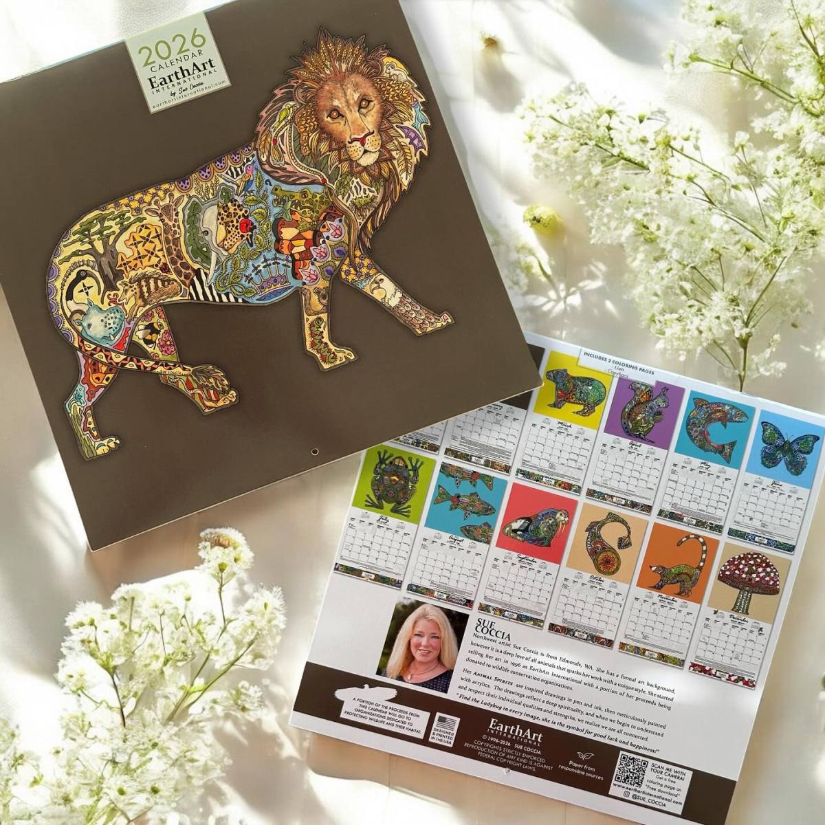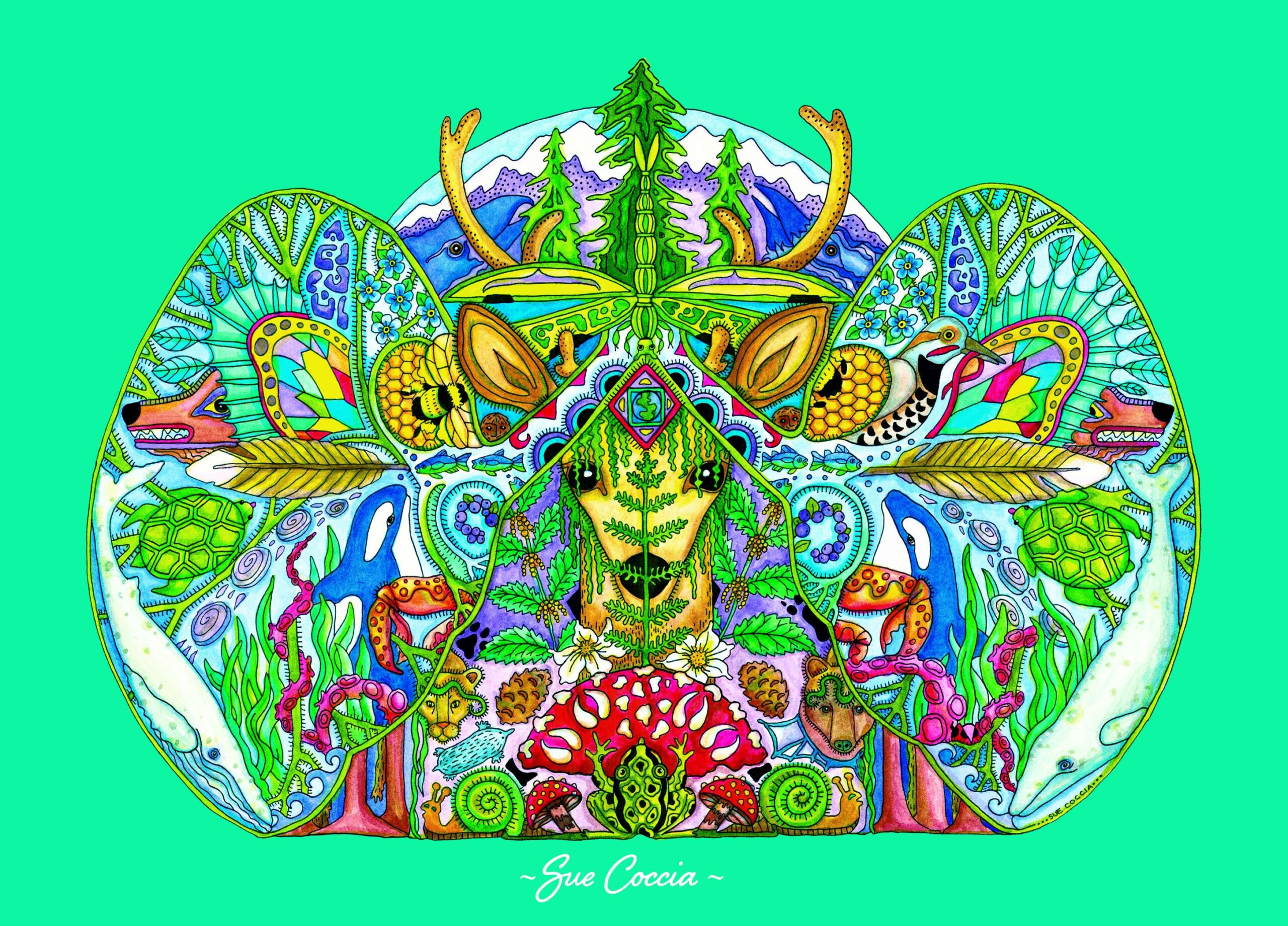 Pacific Northwest artist Sue Coccia based in Edmonds, Washington. With a formal education from the Burnley School for Professional Art, Sue combines technical skill with a lifelong passion for animals and nature. She is best known for her intricate pen and ink drawings, which are meticulously hand-painted with acrylics to create vibrant, symbolic compositions featuring animals from around the world. Each piece incorporates her signature ladybug—a symbol of luck, happiness, and prosperity—woven into the artwork as a subtle reminder of nature’s magic.In 1996, Sue founded Earth Art International, a platform through which she shares her intricate animal imagery while supporting wildlife conservation. A portion of all proceeds goes to organizations dedicated to protecting endangered species and preserving natural habitats. Her work is infused with symbolism drawn from various cultures and timelines, often incorporating elemental themes such as sky, water, and the moon to reflect the interconnectedness of all living things. Sue’s art is not only a visual experience but a spiritual journey. Her pieces represent more than just animals—they embody strength, wisdom, and a sacred connection to the Earth. She believes that by understanding and honoring these qualities, we gain insight into our shared place within the natural world.Sue’s artwork can be found in galleries, national parks, stores, and private collections across the United States, particularly in Alaska and throughout the Pacific Northwest. She has exhibited injuried art festivals since 1996 and is a proud member of the Edmonds Art Studio Tour. Outsideof her artistic work, Sue enjoys gardening, meditation,traveling,spending time with her family,and holds a black belt in Taekwon Do—bringing balance, focus, and discipline to all aspects of her life.
